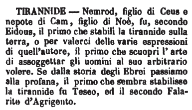 | Tirannide - Nemrod, figlio di Ceus e nepote di Cam, figlio di Noè, fu, secondo Eidous, il primo che stabilì la tirannide sulla terra, o per valerci delle varie espressioni di quell'autore, il primo che scuoprì l'arte di assoggettar gli uomini al suo arbitrario volere. Se dalla storia degli Ebrei passiamo alla profana, il primo che sembra stabilisse la tirannide fu Teseo, ed il secondo Falarite d'Agrigento. [immagine] |