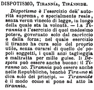 | Tirannia, Dispotismo, Tirannide - Il Dispotismo cieco, o accecato da una non frenata oltrepotenza, può condurre alla Tirannide; è passo ad essa e forse cominciamento. - Tirannia meglio s'intende quando è in azione; Tirannide, il principio, il sistema. Nel Dispotismo è volere assoluto, inappellabile; nella Tirannia è crudeltà, nella Tirannide, ingiustizia. [immagine] |