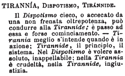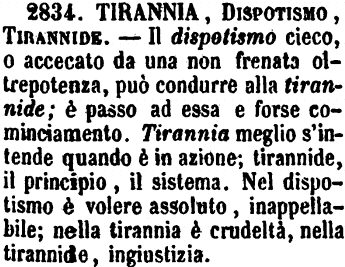 | Tirannia, Dispotismo, Tirannide - Il dispotismo cieco, o accecato da una non frenata oltrepotenza, può condurre alla tirannide; è passo ad essa e forse cominciamento. Tirannia meglio s'intende quando è in azione; tirannide, il principio, il sistema. Nel dispotismo è volere assoluto, inappellabile; nella tirannia è crudeltà, nella tirannide, ingiustizia. [immagine] |