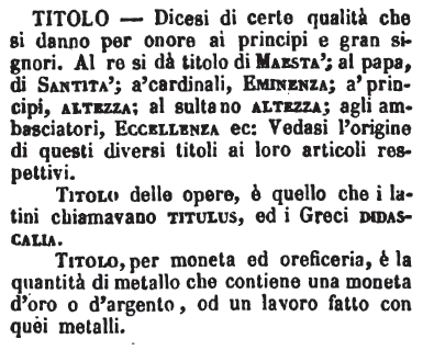 | Titolo - Dicesi di certe qualità che si danno per onore ai principi e gran signori. Al re si dà il titolo di Maestà; al papa, di Santità; a' cardinali, Eminenza; a' principi, altezza; al sultano altezza; agli ambasciatori, Eccellenza ec: Vedasi l'origine di questi diversi titoli ai loro articoli respettivi.