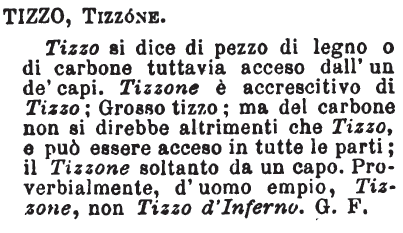 | Tizzo, Tizzone - Tizzo si dice di pezzo di legno o di carbone tuttavia acceso dall'un de' capi. Tizzone è accrescitivo di Tizzo; Grosso tizzo; ma del carbone non si direbbe altrimenti che Tizzo, e può essere acceso in tutte le parti; il Tizzone soltanto da un capo. Proverbialmente, d'uomo empio, Tizzone, non Tizzo d'Inferno. G. F. [immagine] |