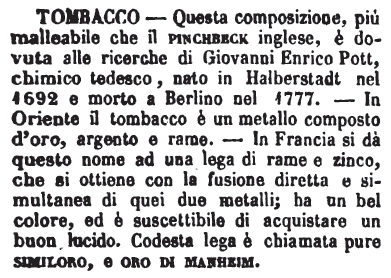 | Tombacco - Questa composizione, più malleabile che il pinchbeck inglese, è dovuta alle ricerche di Giovanni Enrico Pott, chimico tedesco, nato in Halberstadt nel 1692 e morto a Berlino nel 1777. - In Oriente il tombacco è un metallo composto d'oro, argento e rame. - In Francia si dà questo nome ad una lega di rame e zinco, che si ottiene con la fusione diretta e simultanea di quei due metalli; ha un bel colore, ed è suscettibile di acquistare un buon lucido. Codesta lega è chiamata pure similoro, e oro di manheim. [immagine] |