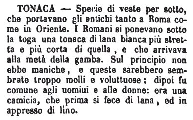 | Tonaca - Specie di veste per sotto, che portavano gli antichi tanto a Roma come in Oriente. I Romani si ponevano sotto la toga una tonaca di lana bianca più stretta e più corta di quella, e che arrivava alla metà della gamba. Sul principio non ebbe maniche, e queste sarebbero sembrate troppo molli e voluttuose: dipoi fu comune agli uomini e alle donne: era una camicia, che prima si fece di lana, ed in appresso di lino. [immagine] |