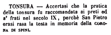 | Tonsura - Accertasi che la pratica della tonsura fu raccomandata ai preti ed a' frati nel secolo IX, perchè San Pietro erasi rasa la testa in memoria della corona di spini. [immagine] |