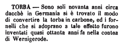 | Torba - Sono soli novanta anni circa dacchè in Germania si è trovato il modo di convertire la torba in carbone, ed i fornelli che si adoprano a tale effetto furono inventati quasi ottanta anni fa nella contea di Wernigerode. [immagine] |
