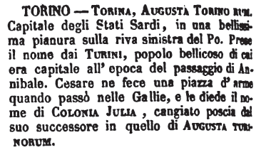 | Torino - Torina, Augusta Torino rum - Capitale degli Stati Sardi, in una bellissima pianura sulla riva sinistra del Po. Prese il nome dai Turini, popolo bellicoso di cui era capitale all'epoca del passaggio di Annibale. Cesare ne fece una piazza d'arme quando passò nelle Gallie, e le diede il nome di Colonia Julia, cangiato poscia dal suo successore in quello di Augusta Turinorum. [immagine] |