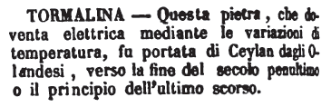 | Tormalina - Questa pietra, che doventa elettrica mediante le variazioni di temperatura, fu portata di Ceylan dagli Olandesi, verso la fine del secolo penultimo o il principio dell'ultimo scorso. [immagine] |