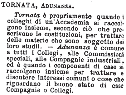 | Tornata, Adunanza - Tornata è propriamente quando i colleghi di un'Accademia si raccolgono insieme, secondo ciò che prescrivono le costituzioni, per trattare delle materie che sono soggetto dei loro studii. - Adunanza è comune a tutti i Collegi, alle Commissioni speciali, alle Compagnie industriali, ed è quando i componenti di esse si raccolgono insieme per trattare e discutere interessi comuni o cose che riguardano il buono stato di esse Compagnie o Collegi. [immagine] |