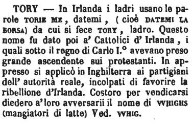 | Tory - In Irlanda i ladri usano le parole torie me, datemi, (cioè datemi la borsa) da cui si fece tory, ladro. Questo nome fu dato poi a' Cattolici d'Irlanda, i quali sotto il regno di Carlo I.° avevano preso grande ascendente sui protestanti. In appresso si applicò in Inghilterra ai partigiani dell'autorità reale, incolpati di favorire la ribellione d'Irlanda. Costororo per vendicarsi diedero a' loro avversarii il nome di whighs (mangiatori di latte) Ved. Whig. [immagine] |
