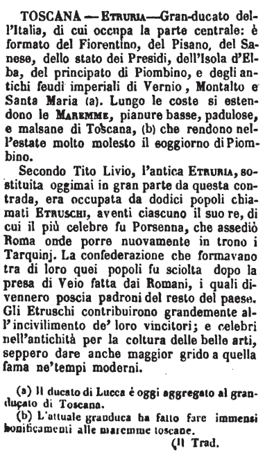 Secondo Tito Livio, l'antica Etruria, sostituita oggimai in gran parte da questa contrada, era occupata da dodici popoli chiamati Etruschi, aventi ciascuno il suo re, di cui il più celebre fu Porsenna, che assediò Roma onde porre nuovamente in trono i Tarquinj. La confederazione che formavano tra di loro quei popoli fu sciolta dopo la presa di Veio fatta dai Romani, i quali divennero poscia padroni del resto del paese. Gli Etruschi contribuirono grandemente all'incivilimento de' loro vincitori; e celebri nell'antichità per la coltura delle belle arti, seppero dare anche maggior grido a quella fama ne' tempi moderni. (a) Il ducato di Lucca è oggi aggregato al granducato di Toscana. (b) L'attuale granduca ha fatto fare immensi bonificamenti alle maremme toscane. (Il Trad. [immagine] |