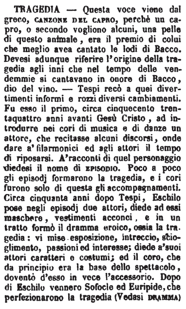 | Tragedia - Questa voce viene dal greco, canzone del capro, perchè un capro, o secondo vogliono alcuni, una pelle di questo animale, era il premio di colui che meglio avea cantato le lodi di Bacco. Devesi adunque riferire l'origine della tragedia agli inni che nel tempo delle vendemmie si cantavano in onore di Bacco, dio del vino. - Tespi recò a quei divertimenti informi e rozzi diversi cambiamenti. Fu esso il primo, circa cinquecento trentaquattro anni avanti Gesù Cristo, ad introdurre nei cori di musica e di danze un attore, che recitasse alcuni discorsi, onde dare a' filarmonici ed agli attori il tempo di riposarsi. A' racconti di quel personaggio diedesi il nome di episodio. Poco a poco gli episodj formarono la tragedia, e i cori furono solo di questa gli accompagnamenti. Circa cinquanta anni dopo Tespi, Eschilo pose negli episodj due attori, diede ad essi maschere, vestimenti acconci, e in un tratto formò il dramma eroico, ossia la tragedia: vi mise esposizione, intreccio, scioglimento, passioni ed interesse; diede a' suoi attori caratteri e costumi; ed il coro, che da principio era la base dello spettacolo, doventò d'esso in vece l'accessorio. Dopo di Eschilo vennero Sofocle ed Euripide, che perfezionarono la tragedia (Vedasi dramma) [immagine] |