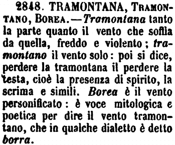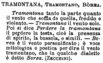 | Tramontana, Tramontano, Borea - Tramontana tanto la parte quanto il vento che soffia da quella, freddo e violento. - Tramontano il vento solo. Poi si dice Perdere la tramontana il perdere la testa, cioè la presenza di spirito, la bussola, e simili. - Borea è il vento personificato; è voce mitologica e poetica per dire il vento tramontano, che in qualche dialetto è detto Borea. (Zecchini). [immagine] |
