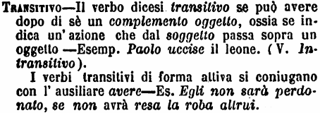 Transitivo - Il verbo dicesi transitivo se può avere dopo di sè un complemento oggetto, ossia se indica un'azione che dal soggetto passa sopra un oggetto - Esemp. Paolo uccise il leone. (V. Intransitivo).