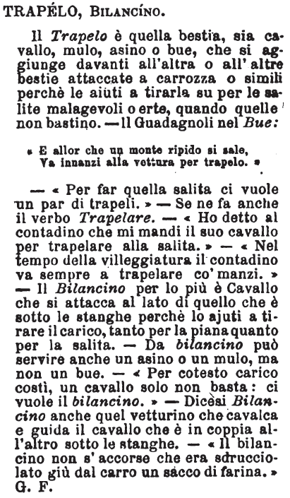 | Trapelo, Bilancino - Il Trapelo è quella bestia, sia cavallo, mulo, asino o bue, che si aggiunge davanti all'altra o all'altre bestie attaccate a carrozza o simili perchè le aiuti a tirarla su per le salite malagevoli o erte, quando quelle non bastino. - Il Guadagnoli nel Bue: