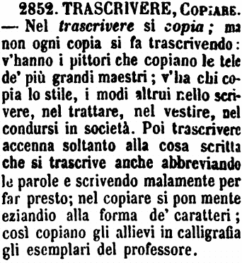| Copiare, Trascrivere - Copiare, che gli antichi dissero Esemplare, è propriamente il riprodurre o uno scritto con la scrittura, o un disegno col lapis, o un quadro col pennello; ed è cosa, più che altro, materiale, e fatta col fine di moltiplicare gli esemplari di una data opera. - Trascrivere è solo della scrittura, ed è lo scrivere sopra un foglio ciò che è scritto nell'altro. Si trascrive spesso per mettere al pulito: il mercante trascrive ogni giorno le sue partite sul libro maestro. [immagine] |