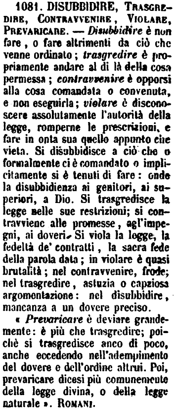 Disubbidire, Trasgredire, Contravvenire, Violare, Prevaricare - Disubbidire è non fare, o fare altrimenti da ciò che venne ordinato; trasgredire è propriamente andare al di là della cosa permessa; contravvenire è opporsi alla cosa comandata o convenuta, e non eseguirla; violare è disconoscere assolutamente l'autorità della legge, romperne le prescrizioni, e fare in onta sua quello appunto che vieta. Si disubbidisce a ciò che o formalmente ci è comandato o implicitamente si è tenuti di fare: onde la disubbidienza ai genitori, ai superiori, a Dio. Si trasgredisce la legge nelle sue restrizioni; si contravviene alle promesse, agl'impegni, ai doveri. Si viola la legge, la fedeltà de' contratti, la sacra fede della parola data; in violare è quasi brutalità; nel contravvenire, frode; nel trasgredire, astuzia o capziosa argomentazione; nel disubbidire, mancanza a un dovere preciso.
