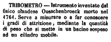 | Tribometro - Instrumento inventato dal fisico olandese Ousschenbroeck morto nel 1761. Serve a misurare o a far conoscere i gradi di attrizione, mediante la quantità di peso che si mette in un bacino sospeso ad un cilindro mobile. [immagine] |