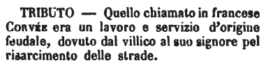| Tributo - Quello chiamato in francese Corvée era un lavoro e servizio d'origine feudale, dovuto dal villico al suo signore pel risarcimento delle strade. [immagine] |