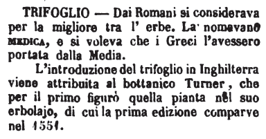 L'introduzione del trifoglio in Inghilterra viene attribuita al bottanico Turner, che per il primo figurò quella pianta nel suo erbolajo, di cui la prima edizione comparve nel 1551. [immagine] |