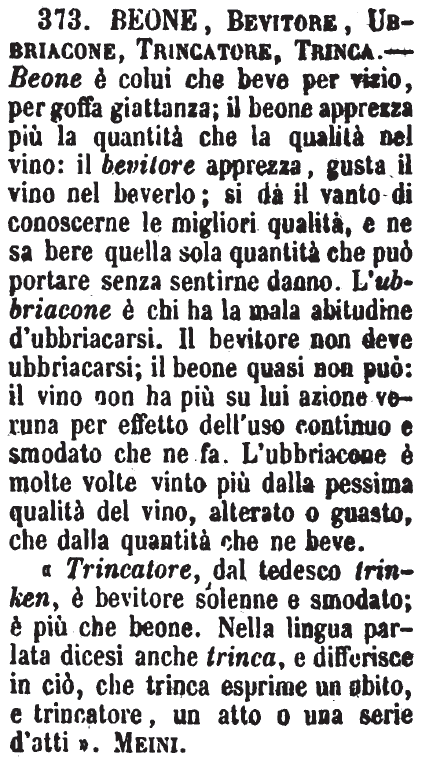 Beone, Bevitore, Ubbriacone, Trincatore, Trinca - Beone è colui che beve per vizio, per goffa giattanza; il beone apprezza più la quantità che la qualità nel vino: il bevitore apprezza, gusta il vino nel beverlo; si dà il vanto di conoscerne le migliori qualità, e ne sa bere quella sola quantità che può portare senza sentirne danno. L'ubbriacone è chi ha la mala abitudine d'ubbriacarsi. Il bevitore non deve ubbriacarsi; il beone quasi non può: il vino non ha più su lui azione veruna per effetto dell'uso continuo e smodato che ne fa. L'ubbriacone è molte volte vinto più dalla pessima qualità del vino, alterato o guasto, che dalla quantità che ne beve.