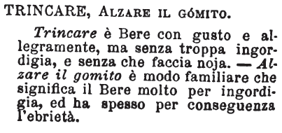 | Trincare, Alzare il gomito - Trincare è Bere con gusto e allegramente, ma senza troppa ingordigia, e senza che faccia noja. - Alzare il gomito è modo familiare che significa il Bere molto per ingordigia, ed ha spesso per conseguenza l'ebrietà. [immagine] |