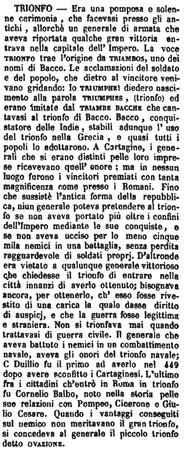 | Trionfo - Era una pomposa e solenne cerimonia, che facevasi presso gli antichi, allorché un generale di armata che aveva riportata qualche gran vittoria entrava nella capitale dell'Impero. La voce trionfo trae l'origine da triambos, uno dei nomi di Bacco. Le acclamazioni del soldato e del popolo, che dietro al vincitore venivano gridando: Io triumphe! diedero nascimento alla parola triumphes, (trionfo) ed erano imitate dal triambe bacche che cantavasi al trionfo di Bacco. Bacco, conquistatore delle Indie, stabilì adunque l'uso del trionfo nella Grecia, e quasi tutti i popoli lo adottarono. A Cartagine, i generali che si erano distinti pelle loro imprese ricevevano quell'onore; ma in nessun luogo furono i vincitori premiati con tanta magnificenza come presso i Romani. Fino che sussistè l'antica forma della repupplica, niun generale poteva pretendere al trionfo se non aveva portato più oltre i confini dell'Impero mediante le sue conquiste, e se non aveva ucciso per lo meno cinque mila nemici in una battaglia, senza perdita ragguardevole di soldati proprj. D'altronde era vietato a qualunque generale vittorioso che chiedesse il trionfo di entrare nella città innanzi di averlo ottenuto; bisognava ancora, per ottenerlo, ch'esso fosse rivestito di una carica la quale dasse diritto di auspicj, e che la guerra fosse legittima e straniera. Non si trionfava mai quando trattavasi di guerra civile. Il generale che aveva battuto i nemici in un combattimento navale, aveva gli onori del trionfo navale; C Duillio fu il primo ad averlo nel 449 dopo aver sconfitto i Cartaginesi. L'ultimo fra i cittadini ch'entrò in Roma in trionfo fu Cornelio Balbo, noto nella storia pelle sue relazioni con Pompeo, Cicerone e Giulio Cesare. Quando i vantaggi conseguiti sul nemico non meritavano il gran trionfo, si concedeva al generale il piccolo trionfo detto ovazione. [immagine] |