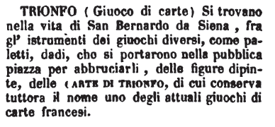 | Trionfo (Giuoco di carte) - Si trovano nella vita di San Bernardo da Siena, fra gl'istrumenti dei giuochi diversi, come paletti, dadi, che si portarono nella pubblica piazza per abbruciarli, delle figure dipinte, delle carte di trionfo, di cui conserva tuttora il nome uno degli attuali giuochi di carte francesi. [immagine] |