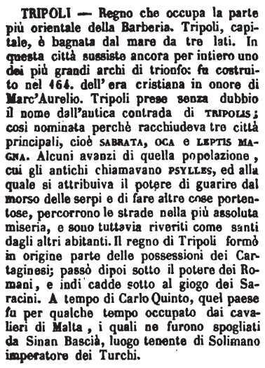 | Tripoli - Regno che occupa la parte più orientale della Barberia. Tripoli, capitale, è bagnata dal mare da tre lati. In questa città sussiste ancora per intiero uno dei più grandi archi di trionfo: fu costruito nel 164. dell'era cristiana in onore di Marc'Aurelio. Tripoli prese senza dubbio il nome dall'antica contrada di tripolis; così nominata perchè racchiudeva tre città principali, cioè sabrata, oca e leptis magna. Alcuni avanzi di quella popolazione, cui gli antichi chiamavano psylles, ed alla quale si attribuiva il potere di guarire dal morso delle serpi e di fare altre cose portentose, percorrono le strade nella più assoluta miseria, e sono tuttavia riveriti come santi dagli altri abitanti. Il regno di Tripoli formò in origine parte delle possessioni dei Cartaginesi; passò dipoi sotto il potere dei Romani, e indi cadde sotto il giogo dei Saracini. A tempo di Carlo Quinto, quel paese fu per qualche tempo occupato dai cavalieri di Malta, i quali ne furono spogliati da Sinan Bascià, luogo tenente di Solimano imperatore dei Turchi. [immagine] |