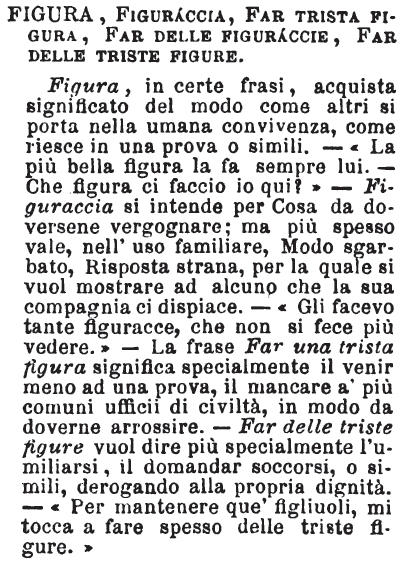 | Figura, Figuraccia, Far trista figura, Far delle figuraccie, Far delle triste figure - Figura, in certe frasi, acquista significato del modo come altri si porta nella umana convivenza, come riesce in una prova o simili. - «La più bella figura la fa sempre lui. - Che figura ci faccio io qui?» - Figuraccia si intende per Cosa da doversene vergognare; ma più spesso vale, nell'uso familiare, Modo sgarbato, Risposta strana, per la quale si vuol mostrare ad alcuno che la sua compagnia ci dispiace. - «Gli facevo tante figuracce, che non si fece più vedere.» - La frase Far una trista figura significa specialmente il venir meno ad una prova, il mancare a' più comuni ufficii di civiltà, in modo da doverne arrossire. - Far delle triste figure vuol dire più specialmente l'umiliarsi, il domandar soccorsi, o simili, derogando alla propria dignità. - «Per mantenere que' figliuoli, mi tocca a fare spesso delle triste figure.» [immagine] |
