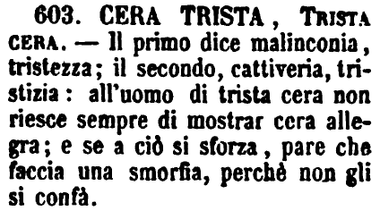 | Cera trista, Trista cera - Il primo dice malinconia, tristezza; il secondo, cattiveria, tristizia: all'uomo di trista cera non riesce sempre di mostrar cera allegra; e se a ciò si sforza, pare che faccia una smorfia, perchè non gli si confà. [immagine] |
