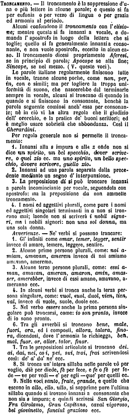 | Troncamento - Il troncamento è la soppressione d'una o più lettere in alcune parole; e questo si fa per eufonia o per vezzo di lingua o per grazia ed armonia al periodo.