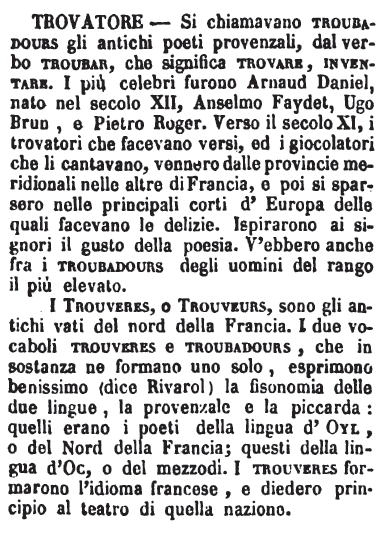 | Trovatore - Si chiamavano Troubadours gli antichi poeti provenzali, dal verbo Troubar, che significa Trovare, Inventare. I più celebri furono Arnaud Daniel, nato nel secolo XII, Anselmo Faydet, Ugo Brun, e Pietro Roger. Verso il secolo XI, i trovatori che facevano versi, ed i giocolatori che li cantavano, vennero dalle provincie meridionali nelle altre di Francia, e poi si sparsero nelle principali corti d'Europa delle quali facevano le delizie. Ispirarono ai signori il gusto della poesia. V'ebbero anche fra i Troubadours degli uomini del rango il più elevato.
