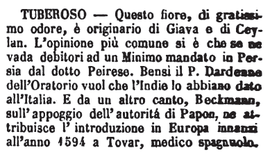 | Tuberoso - Questo fiore, di gratissimo odore, è originario di Giava e di Ceylan. L'opinione più comune si è che se ne vada debitori ad un Minimo mandato in Persia dal dotto Peirese. Bensì il P. Dardenne dell'Oratorio vuol che l'Indie lo abbiano dato all'Italia. E da un altro canto, Beckmann, sull'appoggio dell'autorità di Papon, ne attribuisce l'introduzione in Europa innanzi all'anno 1594 a Tovar, medico spagnuolo. [immagine] |