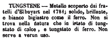 | Tungstene - Metallo scoperto dai fratelli d'Elbuyart nel 1781; solido, brillante, e bianco bigiastro come il ferro. Non si trova nella natura che in istato di tungstato di calce, e tungstato di ferro. Non serve a verun uso. [immagine] |