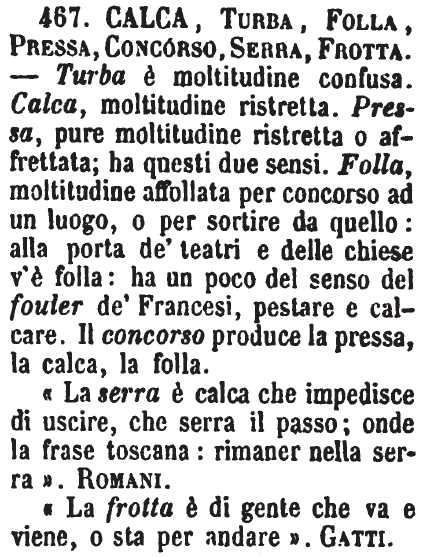 | Calca, Turba, Folla, Pressa, Concorso, Serra, Frotta - Turba è moltitudine confusa. Calca, moltitudine ristretta. Pressa, pure moltitudine ristretta o affrettata; ha questi due sensi. Folla, moltitudine affollata per concorso ad un luogo, o per sortire da quello: alla porta de' teatri e delle chiese v'è folla: ha un poco del senso del fouler de' Francesi, pestare e calcare. Il concorso produce la pressa, la calca, la folla.