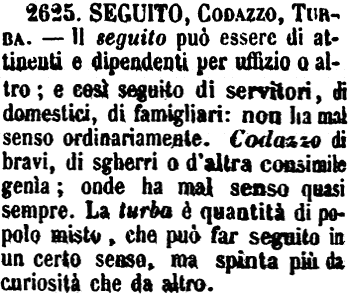 | Seguito, Codazzo, Turba - Il seguito può essere di attinenti e dipendenti per uffizio o altro; e così seguito di servitori, di domestici, di famigliari: non ha mal senso ordinariamente. Codazzo di bravi, di sgherri o d'altra consimile genìa; onde ha mal senso quasi sempre. La turba è quantità di popolo misto, che può far seguito in un certo senso, ma spinta più da curiosità che da altro. [immagine] |