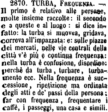 | Turba, Frequenza - Il primo è relativo alle persone, molte insieme raccolte: il secondo e a queste e al luogo: si dice infatto: la turba si muovea, gridava, correva all'impazzata: e: sulle piazze dei mercati, nelle vie centrali della città v'è più e continua frequenza: nella turba è confusione, disordine: perché da turba, turbare, turbamento ecc. Nella frequenza è successione, ripetizione ma ordinata degli atti e de' passi della persona: far con frequenza, frequentare i caffè, i passeggi, una casa e simili. [immagine] |