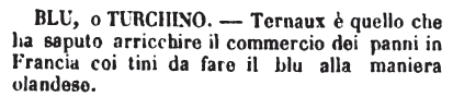 | Blu o Turchino - Ternaux è quello che ha saputo arricchire il commercio dei panni in Francia coi tini da fare il blu alla maniera olandese. [immagine] |