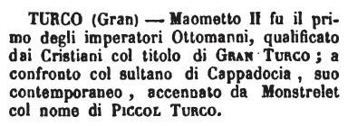 | Turco (Gran) - Maometto II fu il primo degli imperatori Ottomani, qualificato dai Cristiani col titolo di Gran Turco; a confronto col sultano di Cappadocia, suo contemporaneo, accennato da Monstrelet col nome di Piccol Turco. [immagine] |