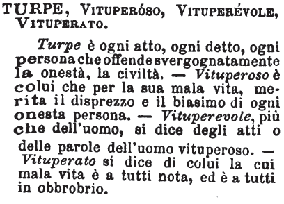 | Turpe, Vituperoso, Vituperevole, Vituperato - Turpe è ogni atto, ogni detto, ogni persona che offende svergognatamente la onestà, la civiltà. - Vituperoso è colui che per la sua mala vita, merita il disprezzo e il biasimo di ogni onesta persona. - Vituperevole, più che dell'uomo, si dice degli atti o delle parole dell'uomo vituperoso. - Vituperato si dice di colui la cui mala vita è a tutti nota, ed è a tutti in obbrobrio. [immagine] |