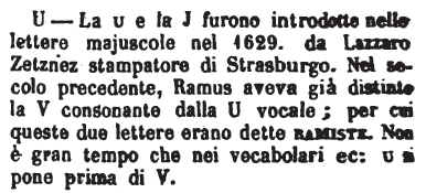 | U - La u e la J furono introdotte nelle lettere majuscole nel 1629. da Lazzaro Zetznez stampatore di Strasburgo. Nel secolo precedente, Ramus aveva già distinte la V consonante dalla U vocale; per cui queste lettere erano dette ramiste. Non è gran tempo che nei vocabolari ec: u si pone prima di V. [immagine] |