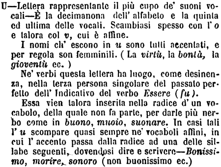 I nomi ch'escono in u sono tutti accentati, e per regola son femminili. (La virtù, la bontà, la gioventù ec.) Ne' verbi questa lettera ha luogo, come desinenza, nella terza persona singolare del passato perfetto dell'Indicativo del verbo Essere (fu). Essa vien talora inserita nella radice d'un vocabolo, della quale non fa parte, per darle più nerbo come in buono, muoio, suonare. In casi tali l'u scompare quasi sempre ne' vocaboli affini, in cui l'accento passa dalla radice ad una delle sillabe seguenti, dovendosi dire e scrivere Bonissimo, morire, sonoro (non buonissimo ec.) [immagine] |