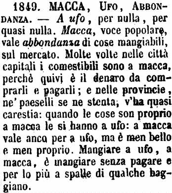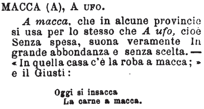 | Macca (A), A ufo - A macca, che in alcune provincie si usa per lo stesso che A ufo, cioè Senza spesa, suona veramente In grande abbondanza e senza scelta. - «In quella casa c'è la roba a macca;» e il Giusti: