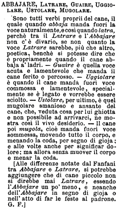| Abbajare, Latrare, Guaire, Uggiolare, Ustolare, Mugolare - Sono tutti verbi proprii del cane, il quale quando abbaja manda fuori la voce naturalmente, e così quando latra, perché tra il Latrare e l'Abbajare non c'è divario, se non quanto la voce Latrare sarebbe, più che altro, poetica, benché si potesse dire che è propriamente quando il cane abbaja a' ladri. - Guaire è quella voce acuta e lamentevole che manda il cane ferito o percosso. - Uggiolare è quando il cane manda fuori voce commossa e lamentevole, specialmente se è legato e vorrebbe essere sciolto. - Ustolare, per ultimo, è quel mugolare smanioso e ansante del cane, che, veduta cosa per lui ghiotta e non possibile ad arrivarci, ne mostra così il vivo desiderio. - Il cane poi mugola, cioè manda fuori voce sommessa, movendo tutto il corpo, e menando la coda, per segno di gioja; e alle volte anche per significar dolore; ma allora senza muover il corpo e menar la coda.