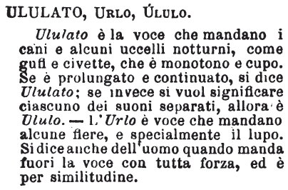 | Ululato, Urlo, Ululo - Ululato è la voce che mandano i cani e alcuni uccelli notturni, come gufi e civette, che è monotono e cupo. Se è prolungato e continuato, si dice Ululato; se invece si vuol significare ciascuno dei suoni separati, allora è Ululo. - L'Urlo è voce che mandano alcune fiere, e specialmente il lupo. Si dice anche dell'uomo quando manda fuori la voce con tutta forza, ed è per similitudine. [immagine] |
