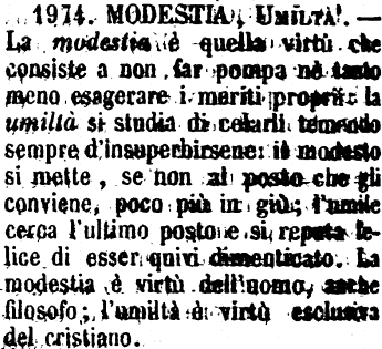 | Modestia, Umiltà - La modestia è quella virtù che consiste a non far pompa nè tanto meno esagerare i meriti proprii; la umiltà si studia di celarli temendo sempre d'insuperbirsene: il modesto si mette, se non al posto che gli conviene, poco più in giù; l'umile cerca l'ultimo posto e si reputa felice di esser quivi dimenticato. La modestia è virtù dell'uomo, anche filosofo; l'umiltà è virtù esclusiva del cristiano. [immagine] |