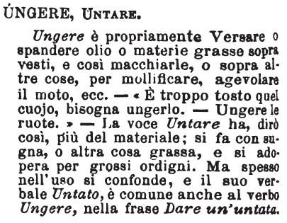 | Ungere, Untare - Ungere è propriamente Versare o spandere olio o materie grasse sopra vesti, e così macchiarle, o sopra altre cose, per mollificare, agevolare il moto, ecc. - «E' troppo tosto quel cuojo, bisogna ungerlo. - Ungere le ruote.» - La voce Untare ha, dirò così, più del materiale; si fa con sugna, o altra cosa grassa, e si adopera per grossi ordigni. Ma spesso nell'uso si confonde, e il suo verbale Untato, è comune anche al verbo Ungere, nella frase Dare un'untata. [immagine] |