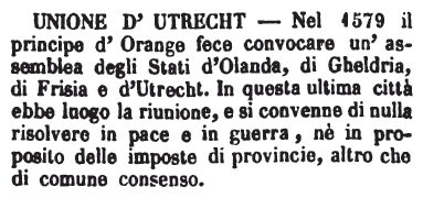 | Unione d’Utrecht - Nel 1579 il principe d'Orange fece convocare un'assemblea degli Stati d'Olanda, di Gheldria, di Frisia e d'Ultrecht. In questa ultima città ebbe luogo la riunione, e si convenne di nulla risolvere in pace e in guerra, nè in proposito delle imposte di provincie, altro che di comune consenso. [immagine] |