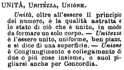 | Unità, Unitezza, Unione - Unità, oltre all'essere il principio del numero, è la qualità astratta e lo stato di ciò che è unito, in modo da formare un solo corpo. - Unitezza è l'essere unito, uniforme, ben piano, e si dice di una superficie. - Unione è Congiungimento e collegamento di due o più cose insieme, e suol pigliarsi anche per Concordia. [immagine] |