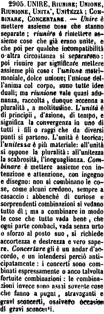 | Unire, Riunire; Unione, Riunione, Unità, Unitezza; Combinare, Concertare - Unire è mettere assieme cose che stanno separate; riunire è rimettere assieme cose che già erano unite, e che poi per qualche incompatibilità o altra circostanza si separarono: poi riunire par significare mettere assieme più cose: l'unione matrimoniale, dolce unione; l'unione dell'anima col corpo, sono tutte idee duali; ma riunione vale quasi adunanza, raccolta, dunque accenna a pluralità, a moltitudine. L'unità è di principii, d'azione, di tempo, e significa la convergenza in uno di tutti i fili o raggi che da diversi punti si partono. L'unità è teorica; l'unitezza è più materiale: all'unità si oppone la pluralità: all'unitezza la scabrosità, l'ineguaglianza. Combinare è mettere assieme con intenzione e attenzione, con ingegno e disegno: non si combinano le cose, come alcuni credono, sempre a casaccio: abbenchè di curiose e sorprendenti combinazioni si vedano tutto dì; ma a combinare in modo le cose che tutto vada bene, che ogni parte combaci, vada senza urto o sforzo al posto suo, si richiede accortezza e destrezza e vero sapere. Concertare gli è un andar d'accordo, e un intendersi perciò anticipatamente: i concerti sono combinati espressamente o anco talvolta fortuite combinazioni: le combinazioni invece sono assai sovente cose che fanno a pugni, stravaganti e gravi sconcerti, ossivero occasioni di gravi sconcerti. [immagine] |